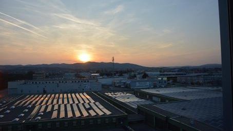 Die neuen Anlage wurden von der W.E.B entwickelt und befindet sich, vom Boden aus nicht sichtbar, auf dem Dach eines Industriegebäudes. Die Nennleistung beträgt jeweils 350 kWp, ein Jahresertrag von 750 MWh wird erwartet, das entspricht dem Verbrauch von ca. 215 Haushalten. Das Highlight des Investorentags war zweifellos die Besichtigung der Anlage vom etwas höher gelegenen Dach des angrenzenden Bürogebäudes aus.