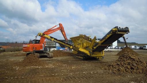 Das Aushubmaterial wird an Ort und Stelle mittels einer Grobstücksiebanlage (siehe Foto) aufbereitet, und muss nicht auf eine kostenpflichtige Deponie verführt werden. In einem Arbeitsgang trennt die Maschine das Aushubmaterial in drei verschiedene Fraktionen und wird von der W.E.B selber weiterverwendet. Das so gewonnene feine Material (Körnung 0/32) für die Hinterfüllung der Baugrube und Künetten, die mittlere Fraktion (Schotter 30/50) als Drainageschotter und das Grobgestein wird in einem zweiten Arbeitsgang mittels Mobilbrecher als Frostschutzmaterial 0/63 und 0/32 aufbereitet und anschließend zum Schottern der Straßen, Vorplätze und Zufahrtswege verwendet.