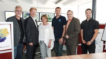 In der Leitzentrale erhielt sie einen Eindruck davon, wie man auch von Pfaffenschlag aus mit qualifizierten Arbeitskräften und modernster Technik einen internationalen Betrieb erfolgreich führen kann. Unser Foto zeigt Sonja Zwazl und Andreas Dangl gemeinsam mit WK-Bezirksstellenobmann Reinhart Blumberger, W.E.B-Sprecher Gerald Simon, Martin Jahn und Mathias Dangl von der Leitzentrale.