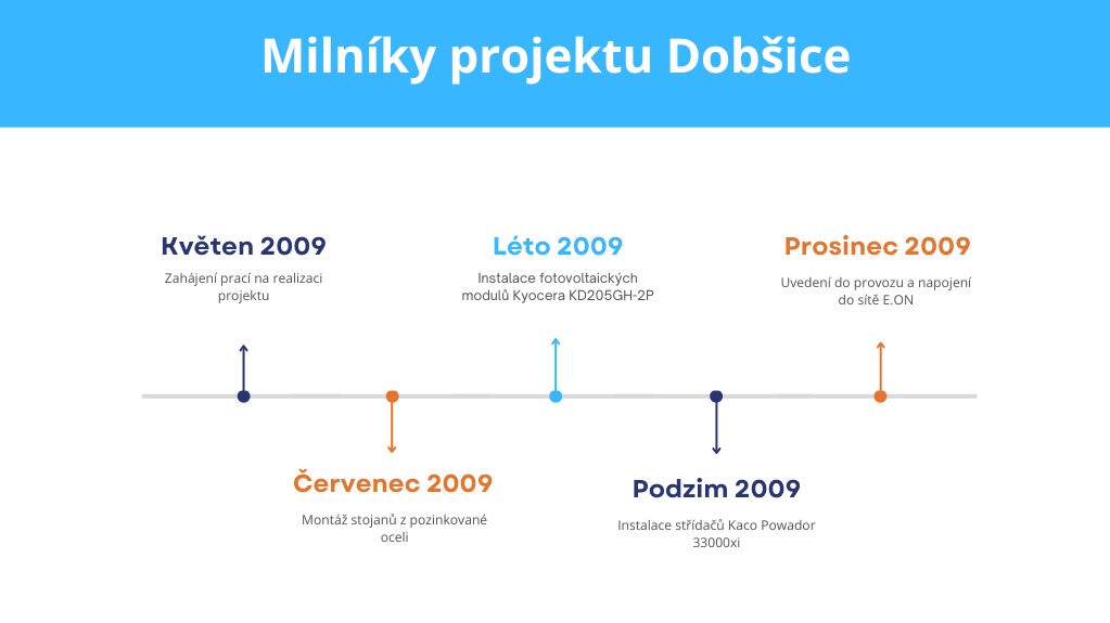 Realizace fotovoltaické elektrárny Dobšice byla zahájena v květnu 2009 stavbou oplocení a pokládkou kabeláže. V červenci následovala montáž nosných konstrukcí, pro které byly použity šroubovací stojany z pozinkované oceli, zajišťující stabilitu a dlouhou životnost systému. Po dokončení konstrukčních prací se přistoupilo k instalaci samotných fotovoltaických modulů. Pro tento projekt jsme zvolili vysoce kvalitní polykrystalické panely Kyocera KD205GH-2P, které vynikají svou spolehlivostí a účinností. Celkem bylo pro výkon 1,03 MW instalováno více než 5000 těchto modulů.